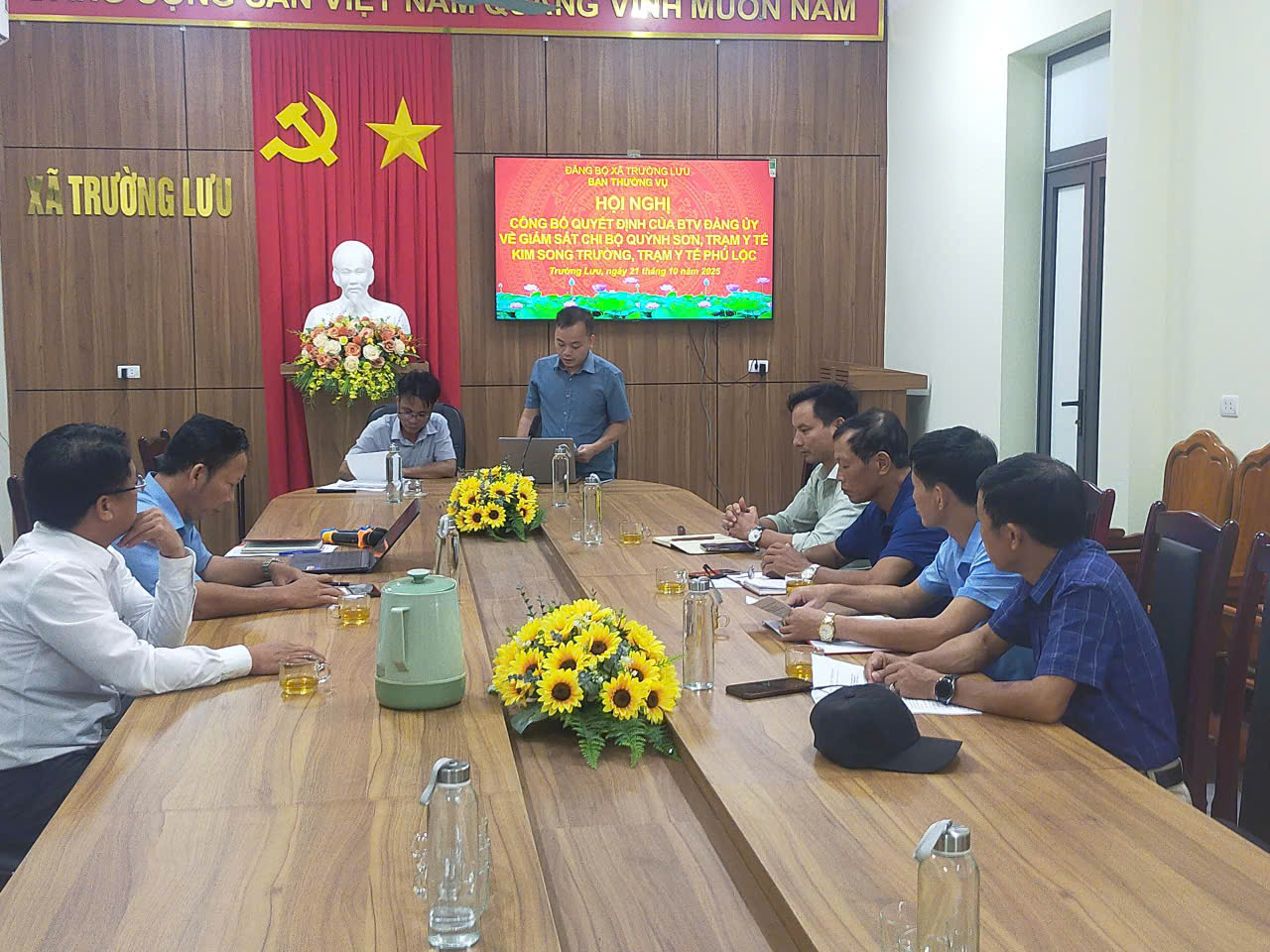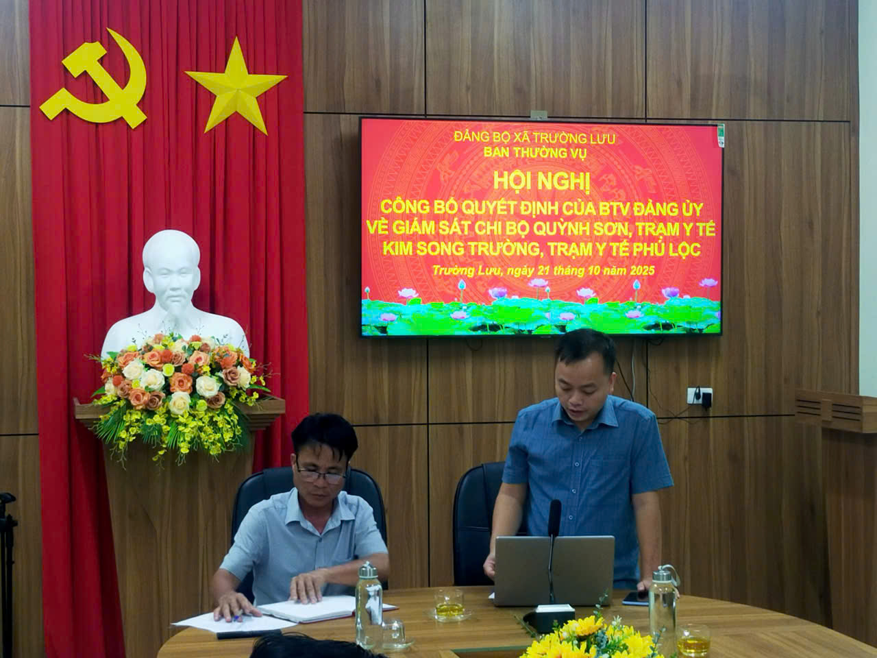 Chiều ngày 21 tháng 10 năm 2025, Đoàn giám sát của Ban Thường vụ Đảng ủy xã Trường Lưu tổ chức Hội nghị công bố Quyết định và Kế hoạch giám sát theo Quyết định số 29-QĐ/ĐU về việc lãnh đạo, chỉ đạo tổ chức xây dựng và thực hiện Quy chế làm việc của chi bộ, chương trình hành động thực hiện Nghị quyết Đại hội chi bộ, Đảng bộ đối với Chi ủy chi bộ Quỳnh Sơn, Trạm y tế Kim Song Trường và chi bộ Trạm y tế Phú Lộc.