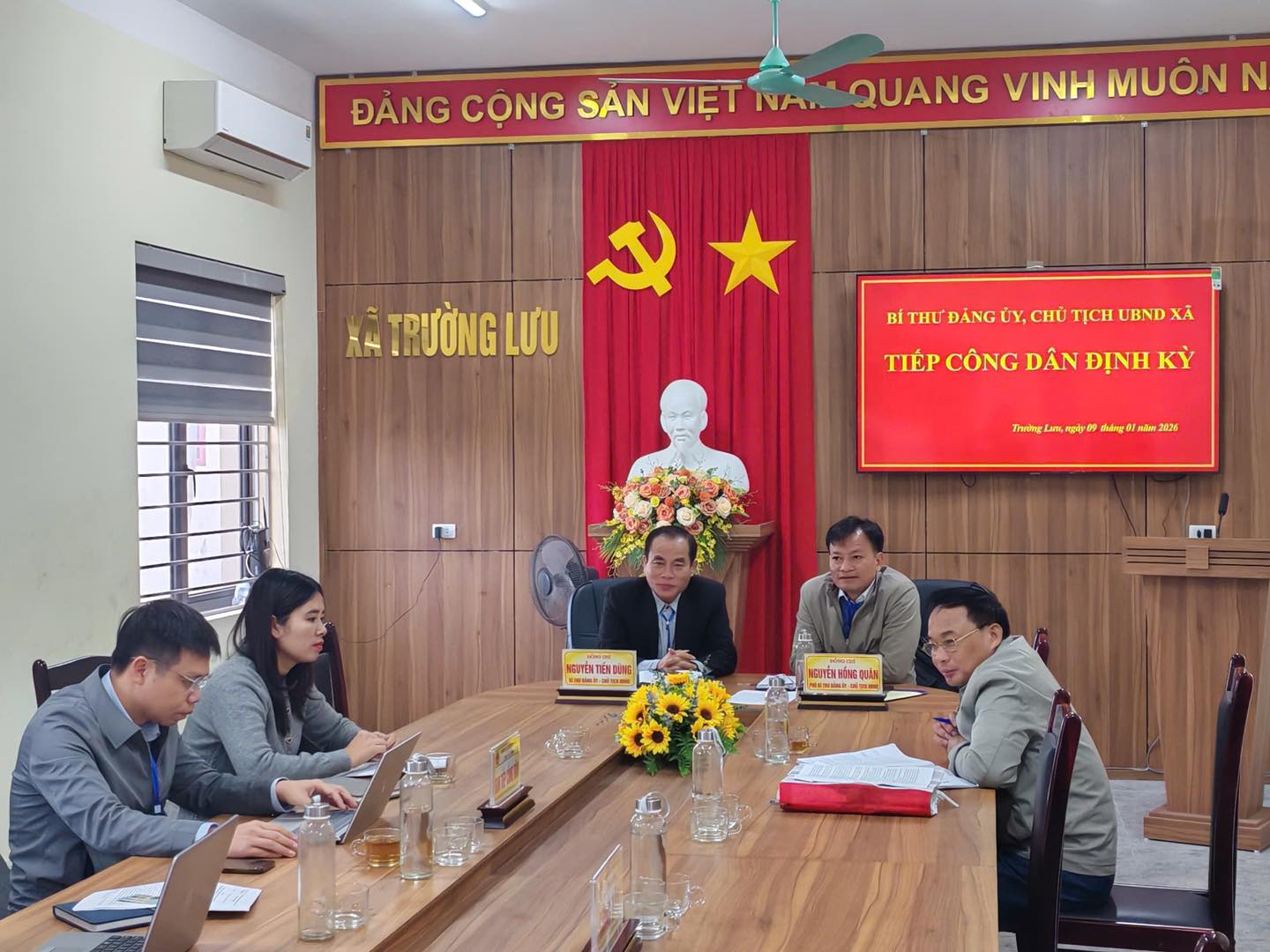 Ngày 09 tháng 01 năm 2026, tại Hội trường tầng 3, nhà làm việc Ủy ban nhân dân xã Trường Lưu, đồng chí Nguyễn Tiến Dũng - Bí thư Đảng ủy, Chủ tịch Hội đồng nhân dân xã và đồng chí Nguyễn Hồng Quân - Phó Bí thư Đảng ủy, Chủ tịch Ủy ban nhân dân xã chủ trì phiên tiếp công dân định kỳ tháng 01 năm 2026.