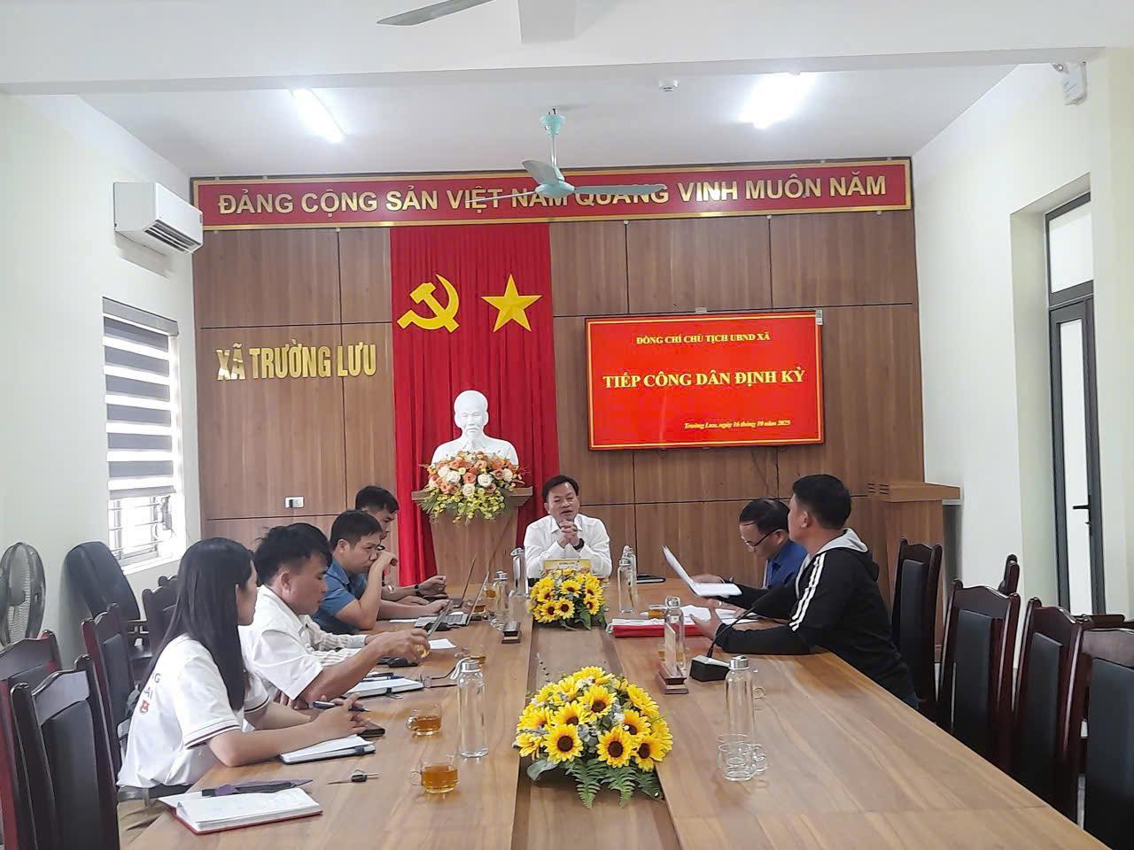 Sáng ngày 16 tháng 10 năm 2025, tại Hội trường tầng 3, nhà làm việc Ủy ban nhân dân xã Trường Lưu, đồng chí Nguyễn Hồng Quân - Phó Bí thư Đảng ủy, Chủ tịch Ủy ban nhân dân xã chủ trì phiên tiếp công dân định kỳ tháng 10 năm 2025.