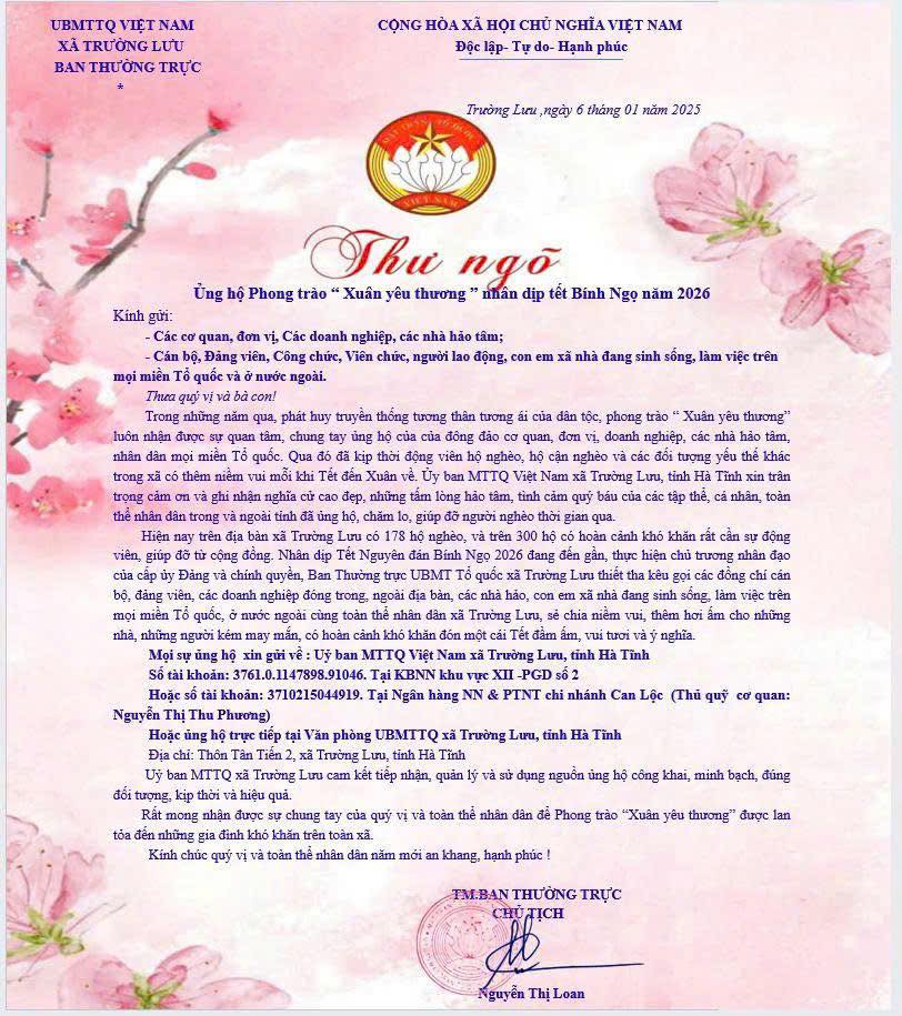 Mọi sự ủng hộ xin gửi về: Uỷ ban MTTQ Việt Nam xã Trường Lưu, tỉnh Hà Tĩnh