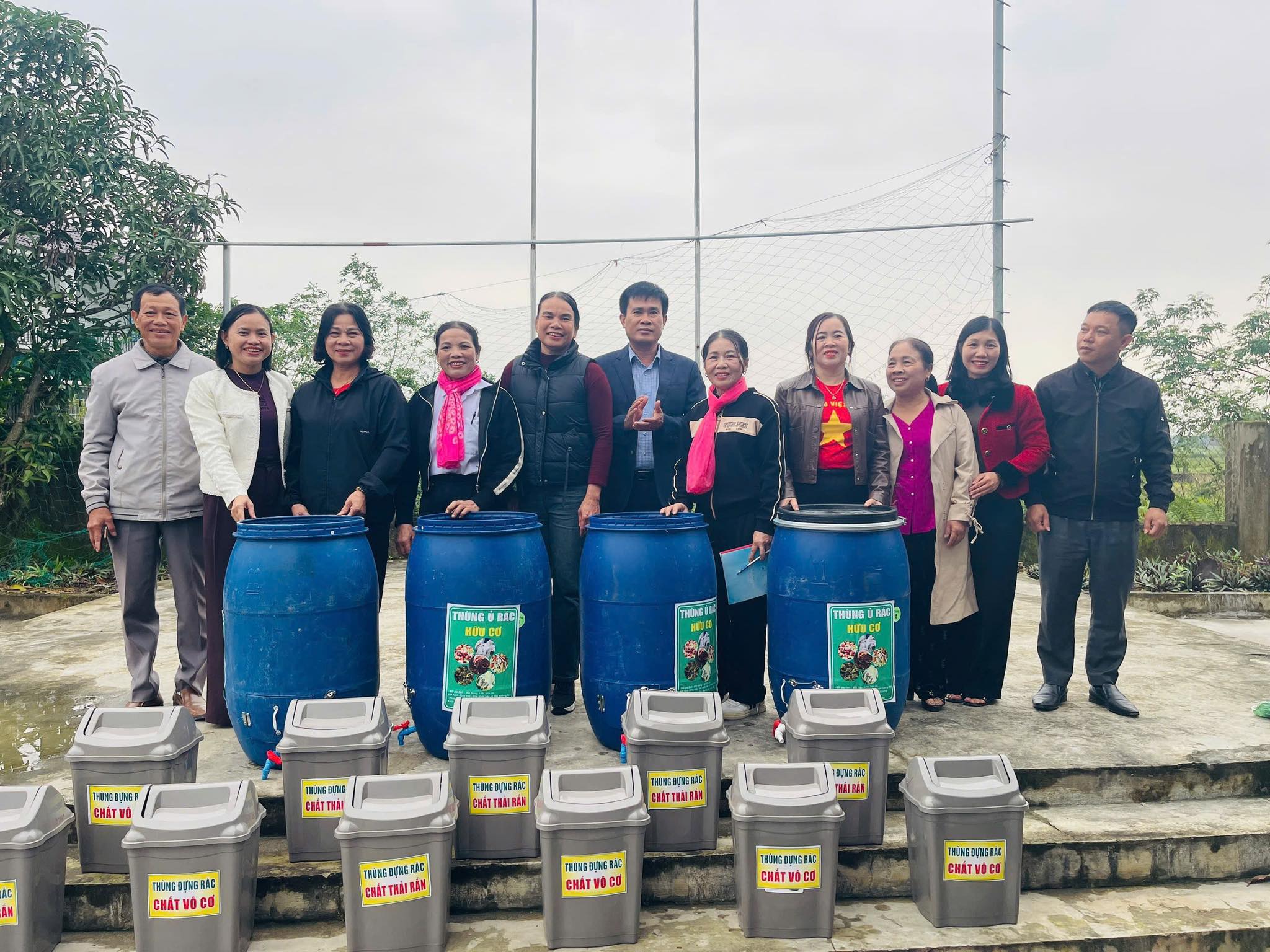 Đại diện các đồng chí lãnh đạo xã, các ngành trao thùng đựng rác tại thôn Quỳnh Sơn