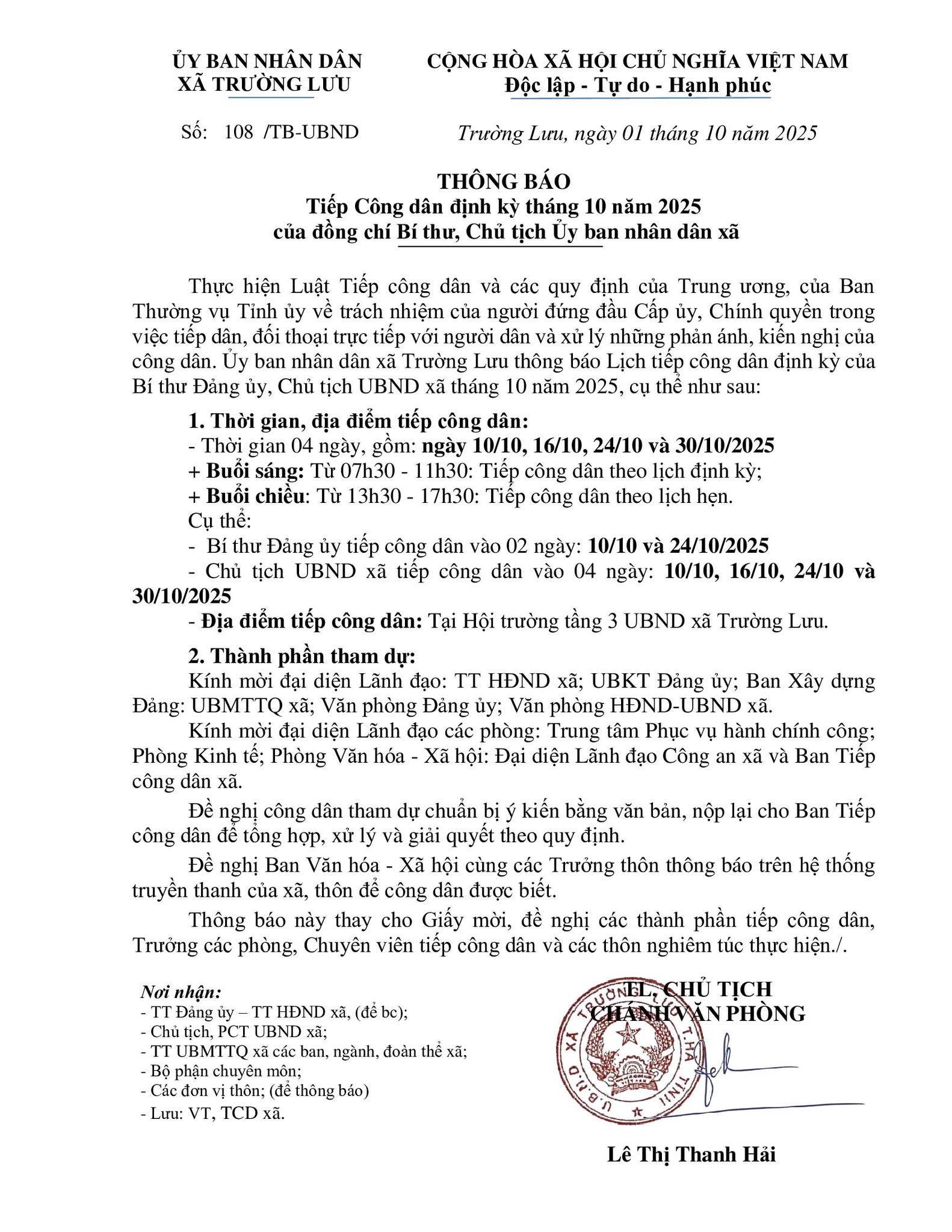Thực hiện Luật Tiếp công dân và các quy định về trách nhiệm của người đứng đầu trong việc tiếp dân, đối thoại, giải quyết kiến nghị của nhân dân, UBND xã Trường Lưu thông báo lịch tiếp công dân định kỳ tháng 10/2025 như sau: