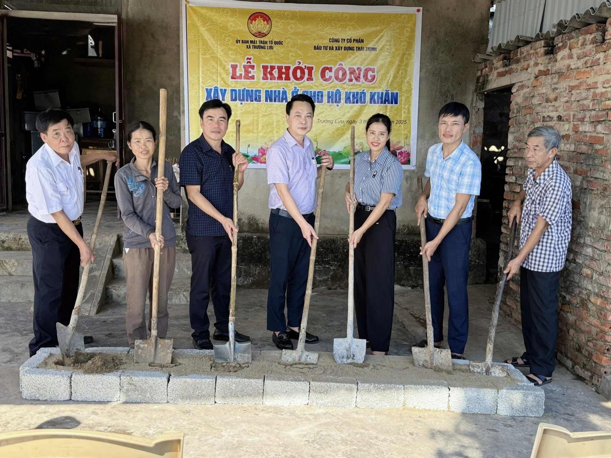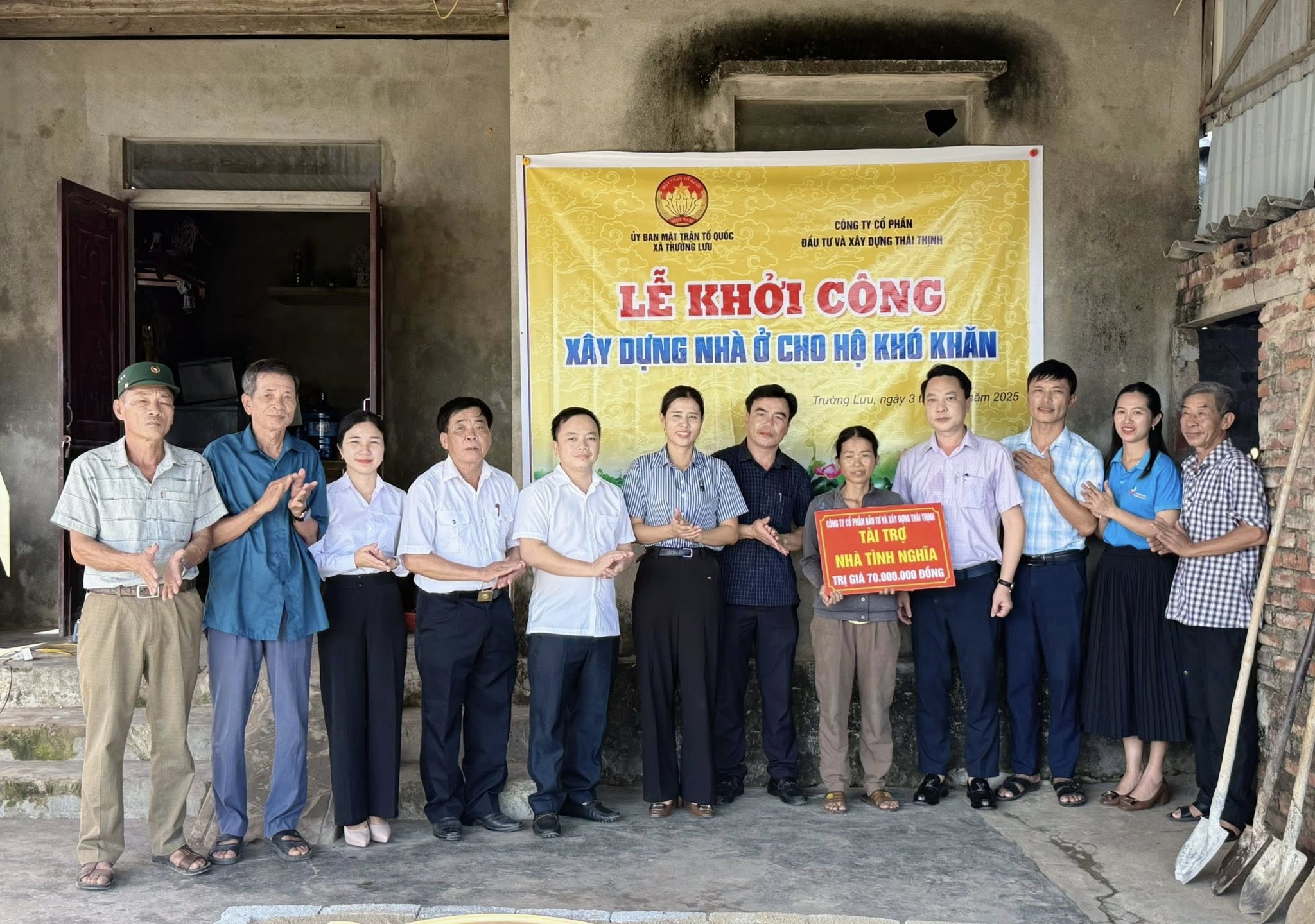 Thiết thực chào mừng thành công Đại hội Đại biểu Đảng bộ tỉnh Hà Tĩnh lần thứ XX, nhiệm kỳ 2025 – 2030; Đại hội Đại biểu Mặt trận Tổ quốc xã Trường Lưu lần thứ nhất, nhiệm kỳ 2025 – 2030, sáng ngày 03/10, Ủy ban MTTQ xã Trường Lưu phối hợp với Công ty Cổ phần Đầu tư và Xây dựng Thái Thịnh (phường Trần Phú, TP Hà Tĩnh) tổ chức khởi công xây dựng nhà tình nghĩa cho hộ gia đình bà Nguyễn Thị Loan (thôn Tân Tiến 2) và bà Lê Thị Hiên (thôn Yên Tràng) với tổng kinh phí hỗ trợ 140 triệu đồng.