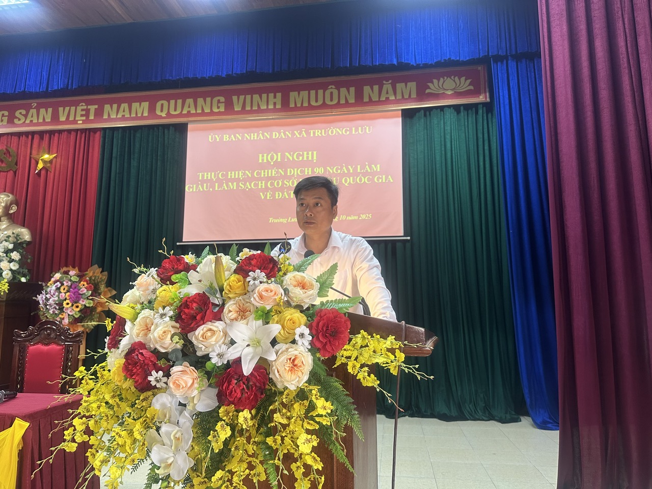 Thực hiện Kế hoạch của Ủy ban nhân dân xã Trường Lưu về việc triển khai Chiến dịch 90 ngày “Làm giàu – Làm sạch” Cơ sở dữ liệu quốc gia về đất đai, sáng ngày 20/10/2025, tại Hội trường lớn UBND xã Trường Lưu, Ủy ban nhân dân xã đã tổ chức Hội nghị triển khai thực hiện chiến dịch.